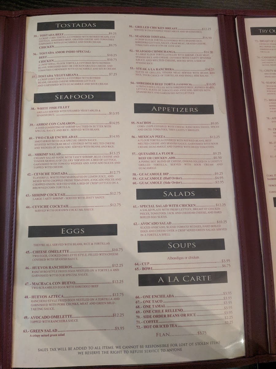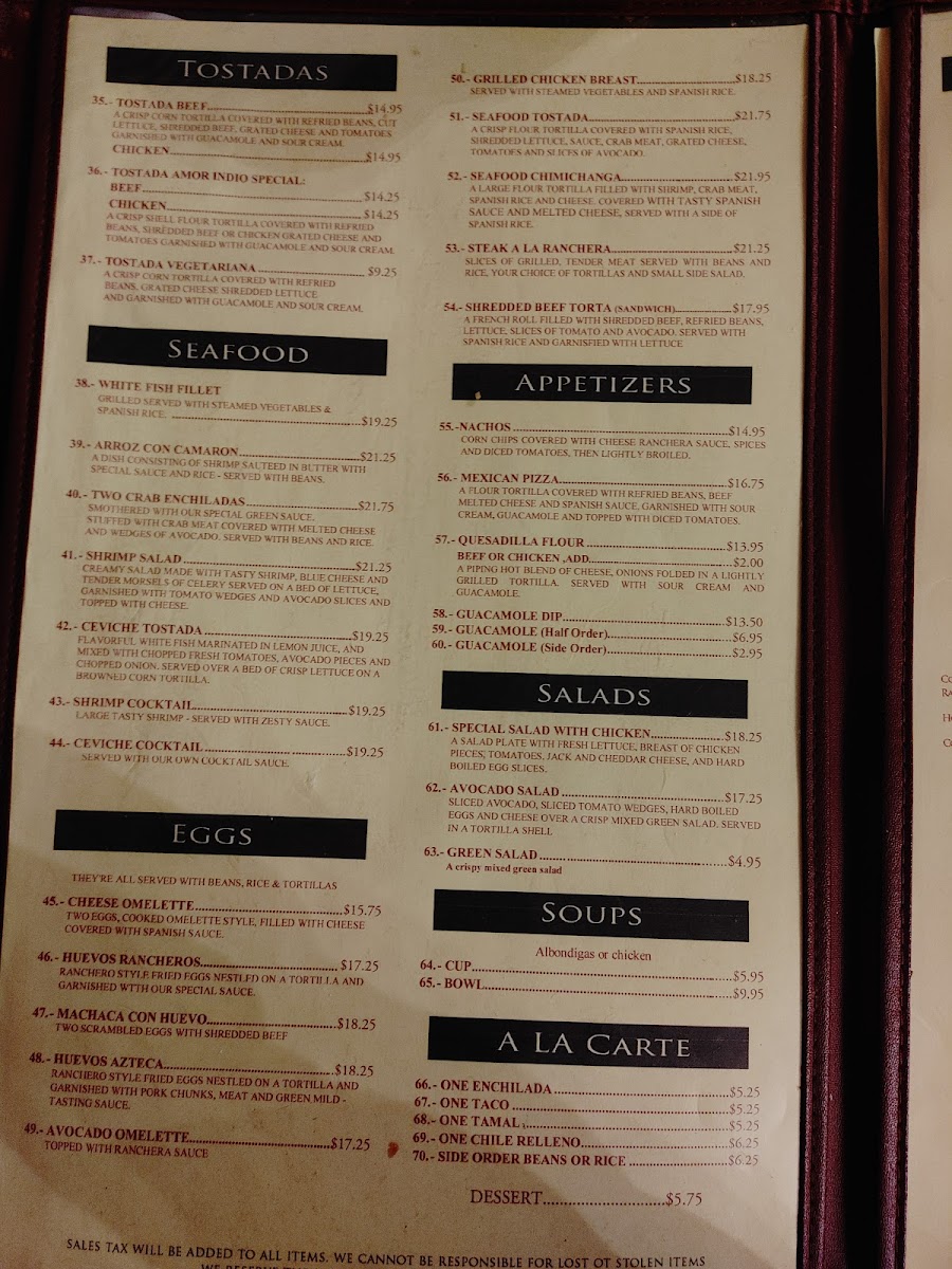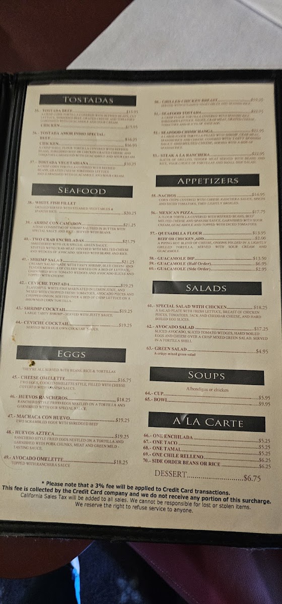 Welcome to Amor Indio Mexican Restaurant, where authentic Mexican flavors come alive! Located at 15200 Valley Blvd in the City of Industry, CA, this vibrant eatery offers a menu bursting with culinary delights. Start your meal with fresh salads like the Special Salad with Chicken or Avocado Salad, priced affordably from $4.95 to $17.25. Dive into their A La Carte options featuring enchiladas, tacos, and tamales. For the adventurous, try new items such as the Chicken Picado or delicious Fish Tacos, reasonably priced at $19.25.